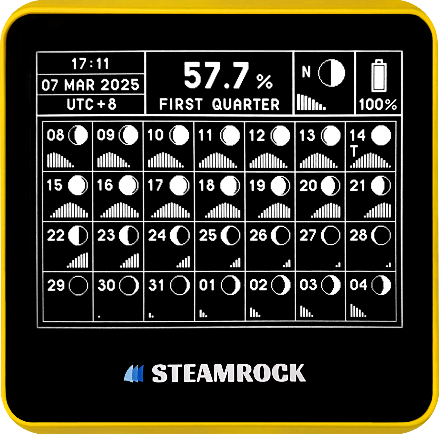 Steamrock Precision Moon Tracker MT-11 Yellow by Steamrock | Feb 23, 2026 | 0 comments New Moon Calendar Submit a CommentYour email address will not be published. Required fields are marked *Comment * Name * Email * Website Δ